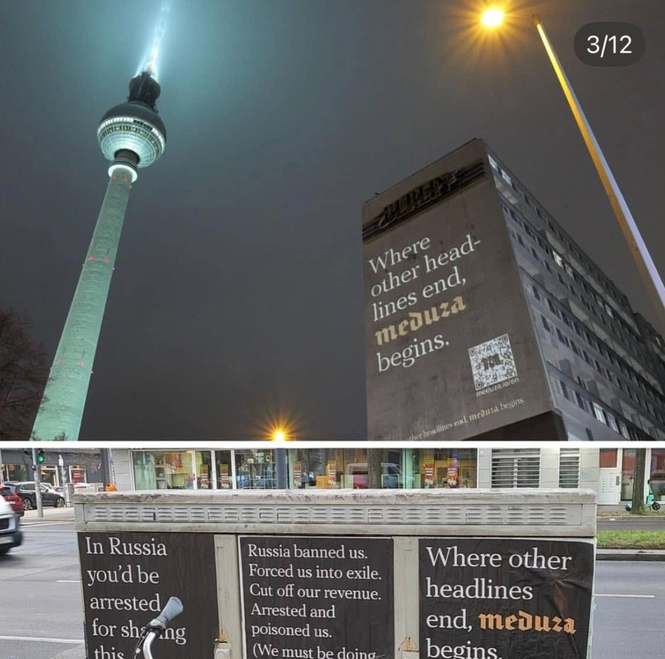 Розробкою цієї реклами для «Медузи» займалося берлінське агентство Lure. За свої послуги агентство не взяло грошей. Гасло кампанії – звучить «Там, де закінчуються інші заголовки, починається «Медуза».