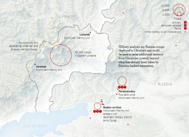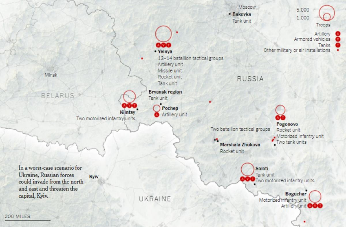 Також значна кількість військових РФ відправлена у північні райони неподалік кордону України, зокрема в Клинці – у місці, де сходяться український, білоруський і російський кордони. Ці позиції розміщені у межах легкої досяжності Києва.Ще три групи розташовані неподалік Воронежа. Ці війська, вказує NYT, можуть становити серйозну загрозу у разі проведення військової операції. Ще одна – в районі Волгограда і дві – біля кордону з окупованими територіями на Донбасі.