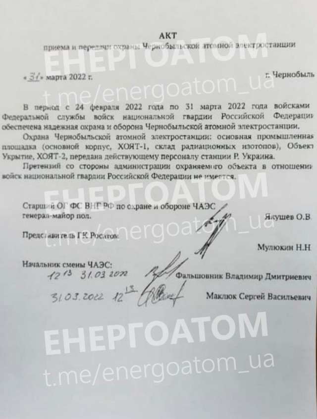 Остаточно підтверджуючи наміри покинути ЧАЕС, окупанти склали і підписали «Акт приёма и передачи охраны Чернобыльской атомной электростанции», в якому засвідчено, що «претензий со стороны администрации охраняемого объекта в отношении войск национальной гвардии Российской Федерации не имеется».Водночас, як пише Бабель, мер Славутича Юрій Фомічов повідомив, що росіяни, які пішли з ЧАЕС, забрали з собою захоплених у полон нацгвардійців. Він також додав, що зараз Славутич тримає зв'язок з навколишніми селами. «Сьогодні десь в обід окупанти пішли з околиць в сторону Білорусі і вже відійшли більше ніж на 40 кілометрів. Вони виходили великою колоною з села Михайло-Коцюбинське. Зараз ми намагаємося вирішувати гуманітарні питання, вже завезли трохи продуктів в місто, їздять волонтери і вивозять людей в Київ — це поки не зелений коридор, люди їдуть на власних машинах».