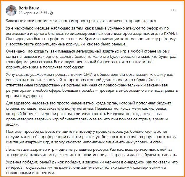 За інформацією ЗМІ, лобістом видачі ліцензії 1xBet був Борис Баум – радник заступника голови Офісу Президента України Кирила Тимошенка. Баум нібито курує гральним бізнесом в Україні і при цьому тісно пов’язаний з російським бізнесом та російським політиком – заступником голови Державної Думи РФ та спецпредставником Путіна Олександром Бабаковим.Після скандалу в українському суспільстві, що виник після рішення КРАІЛ видати ліцензію російському букмекеру, Борис Баум публічно почав захищати 1xBet.