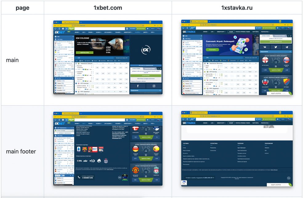 Волонтери з групи BraveUkraine провели масштабне порівняльне дослідження гемблінгових сайтів та мобільних додатків та виклали результати на Github. Серед досліджуваних ресурсів присутні 1XBet та 1XCтавка. Останній офіційно працює в РФ та нібито немає жодного звʼязку із 1XBet та його власниками. Проте код показує протилежне. У ході дослідження волонтери провели порівняння дизайну, технологічного стеку вебсайтів, бекенду та мобільних додатків (Android, iOS).
