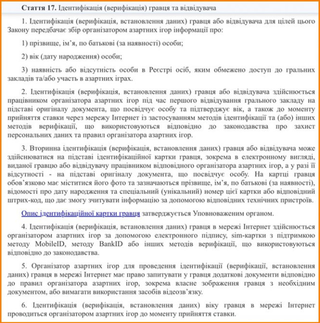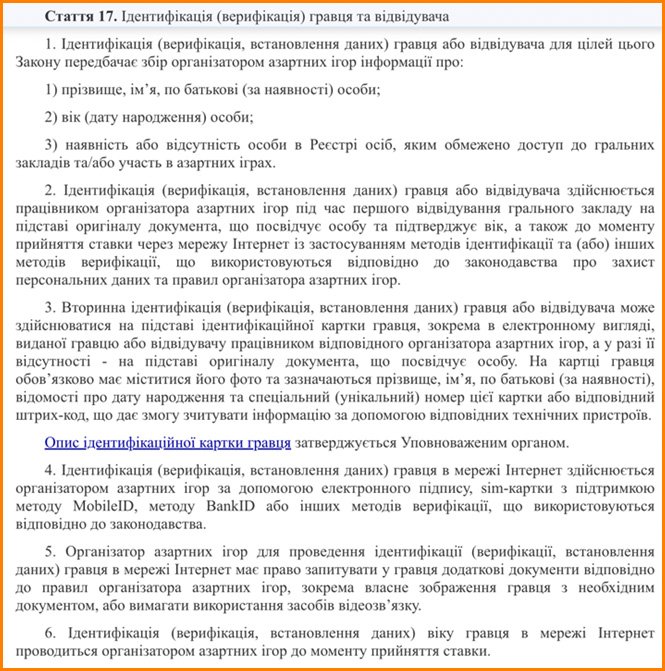 Але як 1XBet отримає особисті дані гравців? Справа в тому, що дозвіл, більш того, обовʼязок це робити вони отримали разом із ліцензією на діяльність в Україні. Закон «Про державне регулювання діяльності щодо організації та проведення азартних ігор» в ст. 16 вимагає від операторів «забезпечувати ідентифікацію гравця (гравців) та відвідувача (відвідувачів) у порядку, визначеному цим Законом, у гральному закладі та ідентифікацію гравця (гравців) під час провадження діяльності в мережі Інтернет». А вже в ст. 17 вказує, що «організатор азартних ігор для проведення ідентифікації (верифікації, встановлення даних) гравця в мережі Інтернет має право запитувати у гравця додаткові документи відповідно до правил організатора азартних ігор, зокрема власне зображення гравця з необхідним документом, або вимагати використання засобів відеозв’язку».