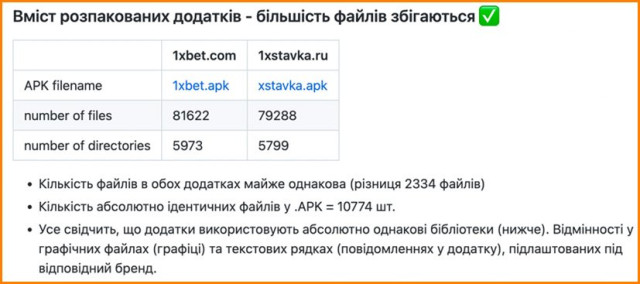 Одразу кидається в очі візуальна подібність сайтів. Не тільки логотипів, а й головної сторінки, контенту та різних форм для користувачів. Та, окрім цього, у ресурсів повністю збігаються набір бібліотек та API-сервіси.В мобільних додатках двох платформ на Android повністю збігається більше 10 тисяч файлів та набір використаних бібліотек в APK-файлах.Додатки в iOS – візуально майже повністю ідентичні. Та ще й з однаковими фреймворками та бібліотеками.