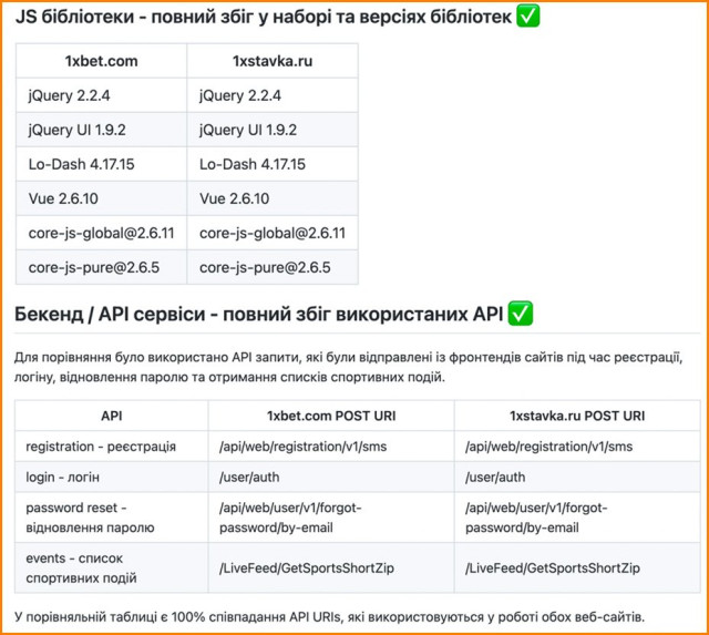 Висновки цього аналізу вказують на практично повне співпадіння програмного забезпечення, вихідних даних для його розробки та технічної підтримки. А це означає, що 1XСтавка, навіть не приховуючи, використовує технології 1XBet.