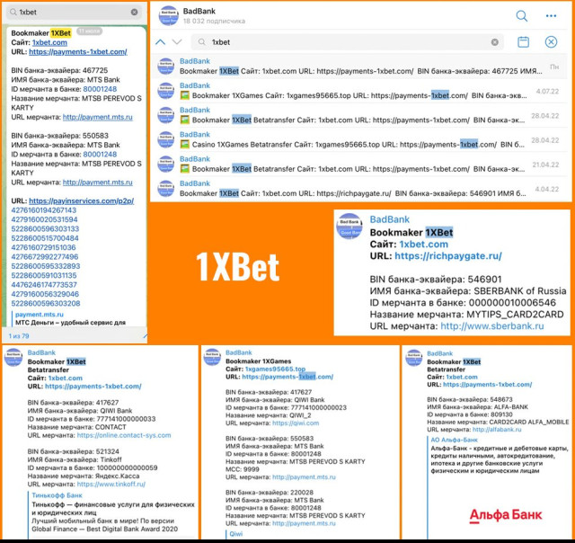 Ще одне підтвердження присутності 1XBet в РФ – банківські операції. В Росії є Телеграм-канал Badbank, який спеціалізується на публікації зливів про банки, які займаються еквайрингом платежів казино. Опубліковану там інформацію досить легко перевірити за рахунок великої кількості платежів. При введенні в пошук запросу «1xbet» канал видає 79 публікацій. Остання з них датується 11 липня 2022 року і демонструє, що платежі для букмекера проводить сервіс «МТС-Деньги».
