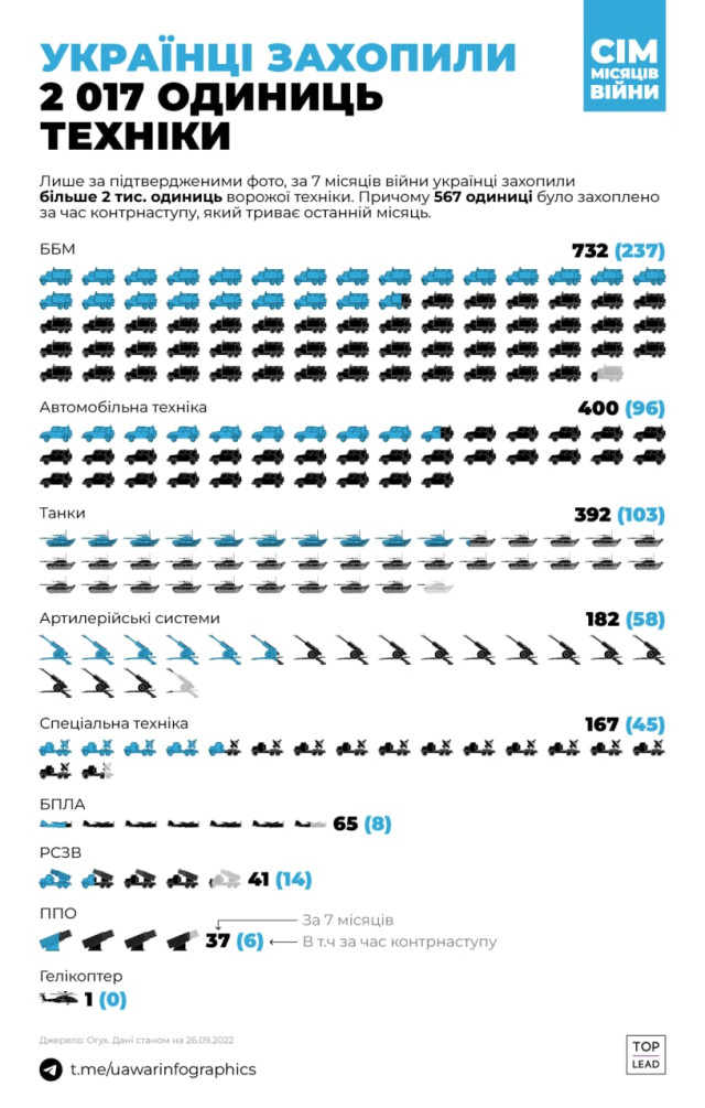 Сили оборони України за сім місяців війни проти Росії захопили понад дві тисячі одиниць її військової техніки. Причому трохи більше ніж пів тисячі бронемашин і озброєння потрапили до рук захисників під час контрнаступу, який триває протягом останнього місяця.