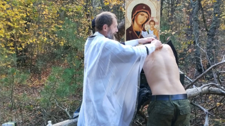 «На повалене дерево поставили ящик з-під боєприпасів, проклавши його зсередини поліетиленовим мішком. На це ж дерево встановили велику казанську ікону Божої Матері. Для ніг принесли картонну коробку, яку також проклали мішком.До слова, був у цьому хрещенні свій символізм. У хрещенні людина вмирає для гріха, і вони хрестилися в «похоронних» пакетах; народжується нова людина – воїн Христовий, а вони руки опускали в ящик з-під боєприпасів. Благодать Божа для християн – як боєприпаси для солдатів», – написав маразматик у рясі.