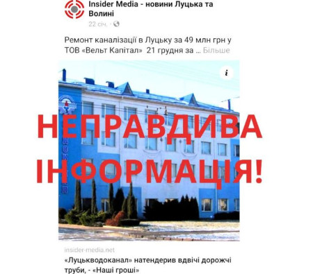 Як повідомили у пресслужбі водоканалу, нещодавно окреме інформаційне видання намагалось «сколихнути інфопростір» черговим фейковим вкидом щодо вартості труб, начебто придбаних КП «Луцькводоканал» для ремонту аварійного колектора в Луцьку, який перебуває в критичному стані і загрожує обвалом. Одразу ж кілька «експертів» уже далеко не вперше почали безуспішно намагатися «розігнати цю тему» в інфопросторі Луцька.
