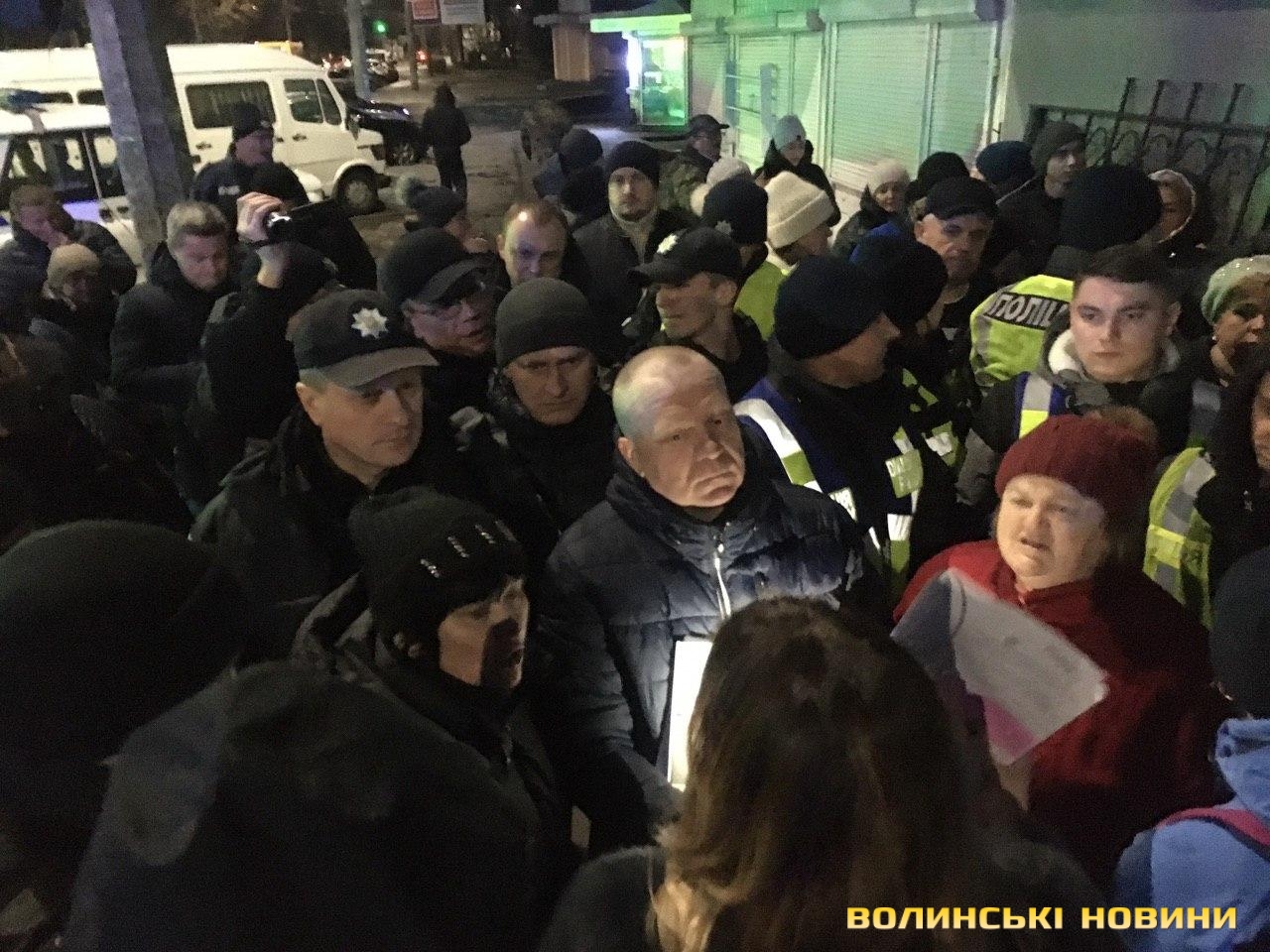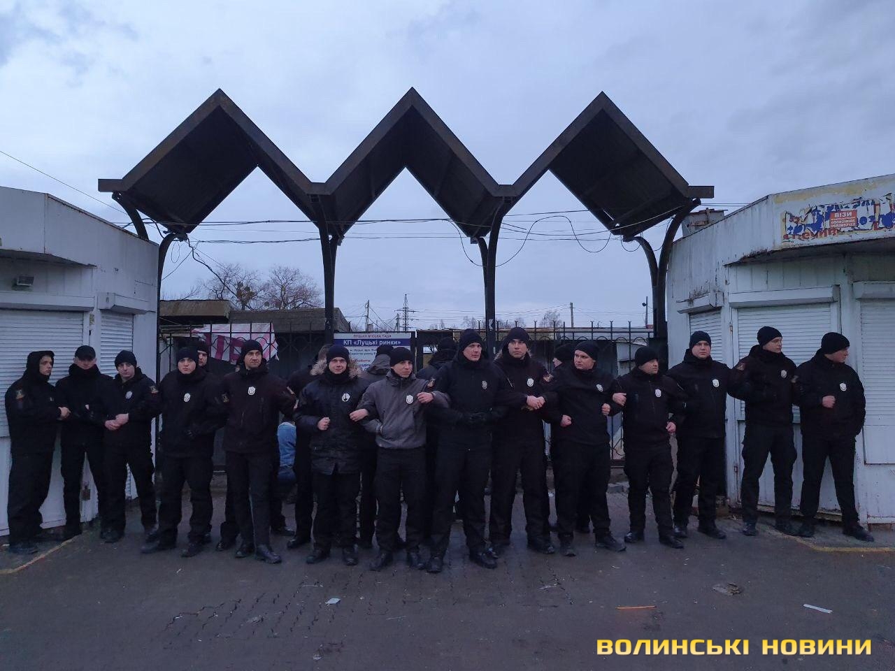 На місці присутні працівники поліції, які спостерігають за демонтажем. Їх попередили про проведення демонтажу незаконно встановлених об'єктів заздалегідь офіційним листом. Також на місці присутній очільник патрульної поліції Волині Андрій Крутень.