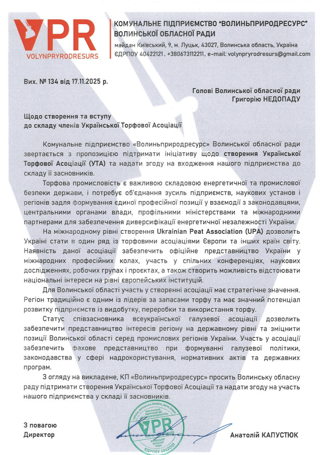 17 листопада 2025 року КП «Волиньприродресурс» направило офіційний лист на ім’я голови Волинської обласної ради Григорія Недопада. У документі підприємство просить підтримати ініціативу створення Української Торфової Асоціації та надати згоду на входження КП «Волиньприродресурс» до складу її засновників.