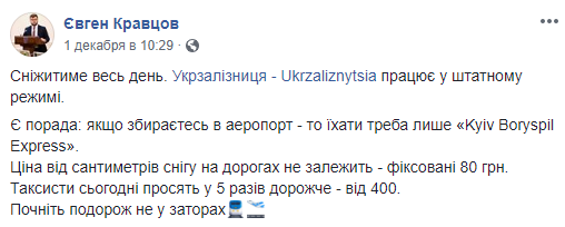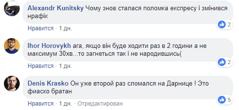 При цьому вранці 1 грудня, буквально за годину до поломки, в. о. голови правління «Укрзалізниці» Євген Кравцов на своїй сторінці в Facebook порадив пасажирам в цей сніжний день добиратися до аеропорту лише на експресі.Після другої поломки 4 грудня користувачі залишили обурені коментарі на сторінці керівника "Укрзалізниці".Перша поломка експреса