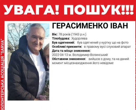 13 квітня безвісти зник 78-річний чоловік з Володмира Іван Герасименко.