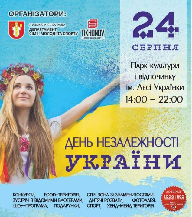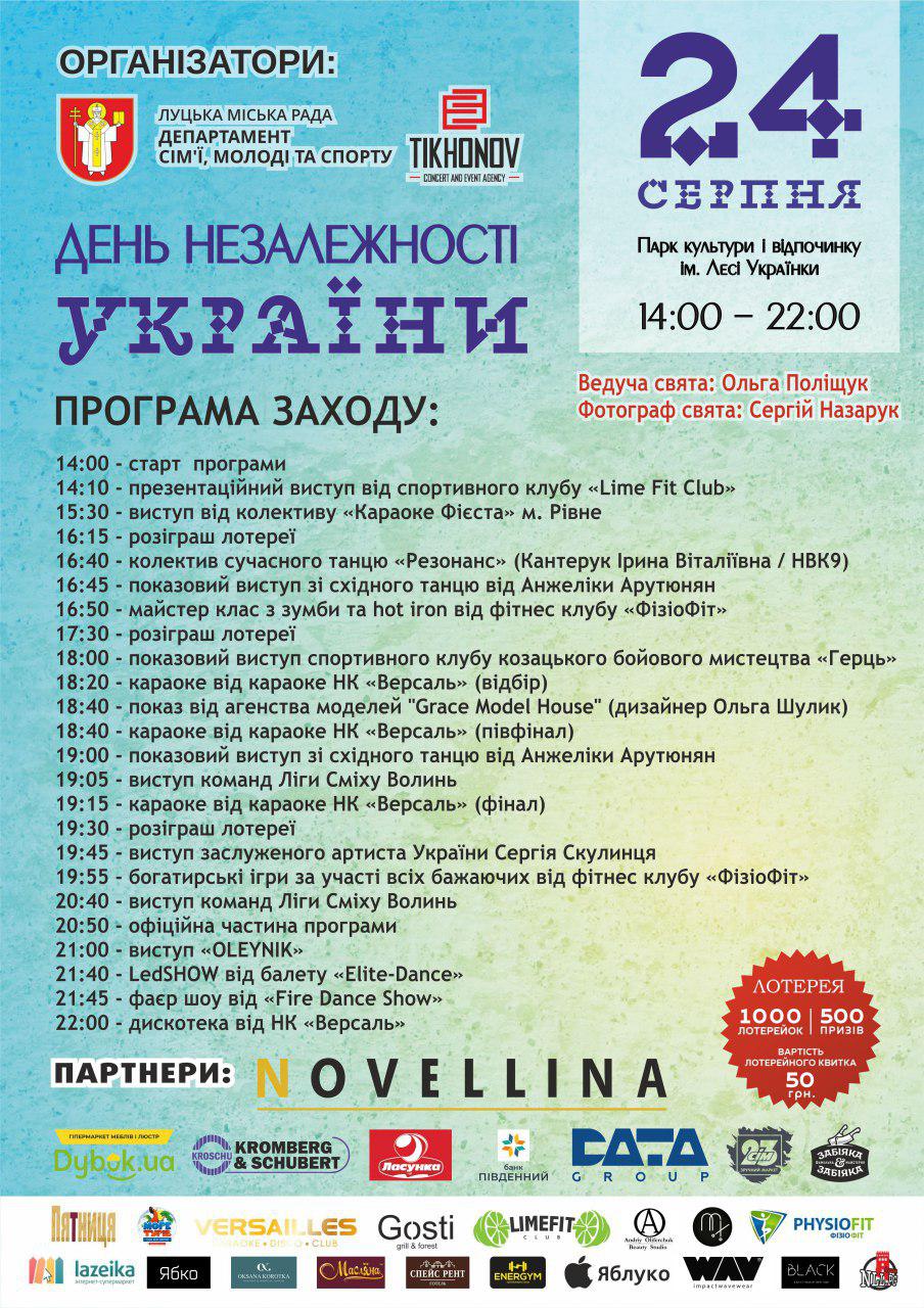 Також під час святкування виступить музикант, відмий артист, гравець футбольного клубу зірок шоу-бізнесу «Маестро», переможець проекту «Фабрика Зірок-2» OLEYNIK. Музикант презентує як нові, так і вже всіма улюблені та популярні пісні, на сцені в парку о 21:00.Лучан та гостей міста закликають цікаво й весело відсвяткувати День Незалежності та отримати позитивні емоції.Організатори події : Івент-агенція «Tikhonov сoncert and event agency», Луцька міська рада та департамент сім’ї, молоді та спорту.Інформаційні партнери події : Волинь Online, Волинські Новини, ВолиньPost, Конкурент, Таблоїд Волині, Район.Луцьк, Волинська Правда, Бізнес.Район, Перший, 0332.UA, СіД FM, Лу Радіо, Наш Луцьк Life, NLL PROMO GROUP.