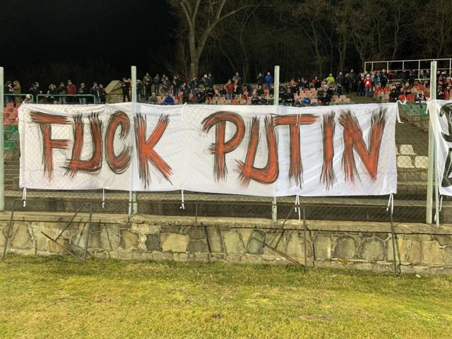 «Руска курва олє-олє-олє», — було чутно з трибун стадіону у Варшаві. Також фанати тримали банер, який не потребує перекладу:У Першому дивізіоні Польщі фанати Заглембе (Сосновець) вивісили банер проти окупанта:Читати ще: Швеція офіційно відмовилася грати з Росією в кваліфікації ЧС-2022