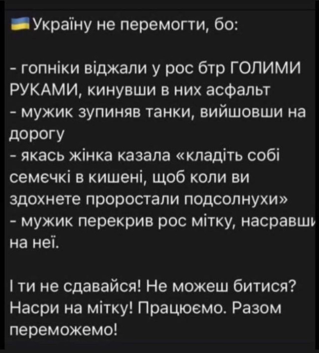 Чи не найпершим поширеним мемом став «русскій воєнний карабль, іди на хуй», який присвячений захисникам острова Зміїний. До слова, за першими повідомленнями усі воїни на острові загинули, оскільки з ними обірвався зв’язок, але потім з’явилася інформація про те, що хлопці живі.Використав цей мем і Автодор, написавши на вказівних знаках напрямок руху для росіян. А у мережі почали писати, що нарешті дорожня служба зробила все правильно.Чимало мемів присвячено геройству різних верств українського населення, зокрема про гопніків, які відп***ли москалів та віджали БТР; циганів, які вкрали танк; жінку, яка сказала російським солдатам покласти в кармани насіння, щоб воно файно росло, коли вони ляжуть в українську землю.Є й меми про екскурсії росіян до Києва та про державні програми для них.А меми про паляницю та «в Україні а не на» навіть допомагають виявити рашистів.Багато мемів з’явилося після відключення Росії від популярного сервісу PornHub, тож тепер вони збуджуються на український прапор.Україну підтримали навіть Сімпсони.Решта мемів – про мертвих російських солдатів, яких відключили від SWIFT, вже легендарну баба Надю, прийом НАТО до ЗСУ, коктейлі Молтова та мітки. Сміємося, українці та волиняни, бо якщо ми продукуємо гумор навіть у такі складні часи, то ми обов’язково переможемо клятих москалів!