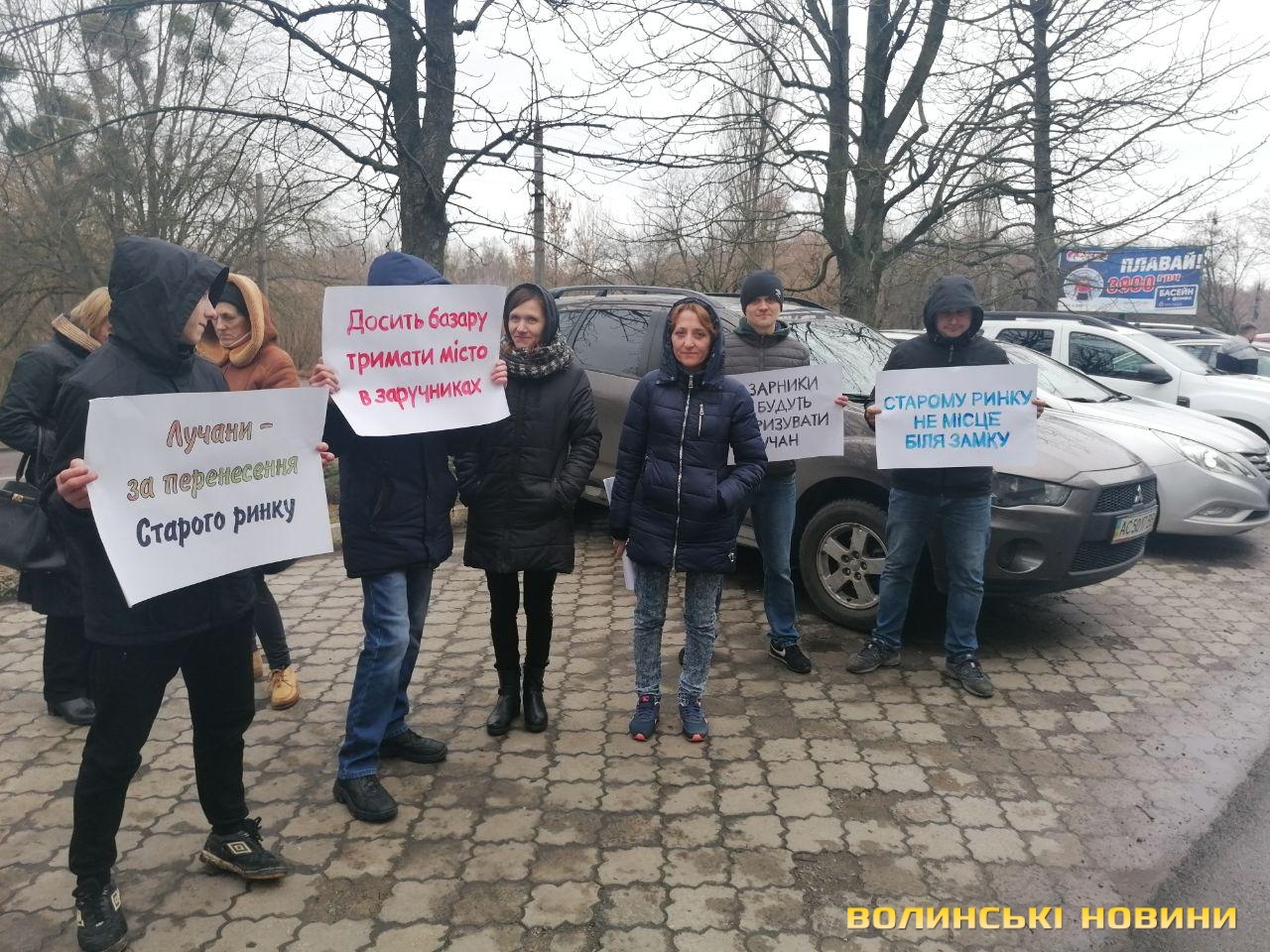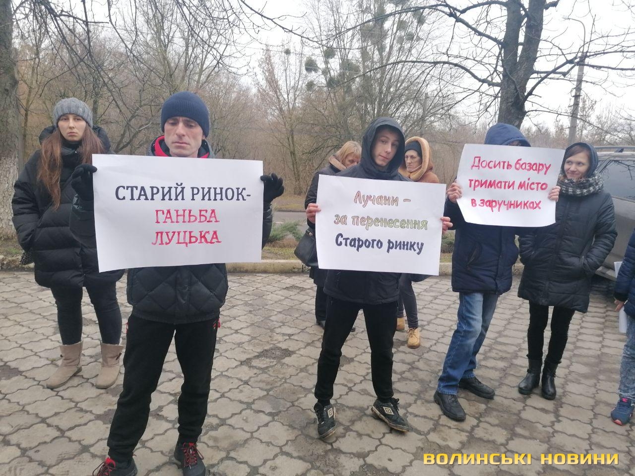 Присутні на мітингу лучани тримали в руках плакати з лозунгами «Старий ринок – антисанітарія, бруд, хамство», «За європейський Луцьк, без смітника біля замку», «Лучани – за перенесення Старого ринку», «Досить базару тримати місто в заручниках» тощо.