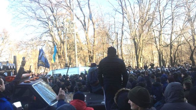 Як повідомляє кореспондент BBC News Україна, на мітингу є представники «Батьківщини», «Свободи» і Нацкорпусу.