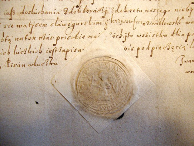 За словами позивача, маґістрат особливо не переймався правовою обізнаністю та моральними якостями свідків, бо «Іван Богомаз, свідок на той час, напившись горілки, свідчив… Роман Блажнин від розуму відходить і п’яницею великим є. Іван Сезень віку поважного, має більше, аніж сімдесят літ». Найстарішому ж свідку-лучанину в тій справі, як вказував Ян Адріяшевич, було «літ більше за сто» (!). Такі люди, на переконання шляхетного пана, не могли правдиво свідчити й адекватно сприймати реальність.Печатка луцької лави iз зображенням архангела, початок ХVII столiття