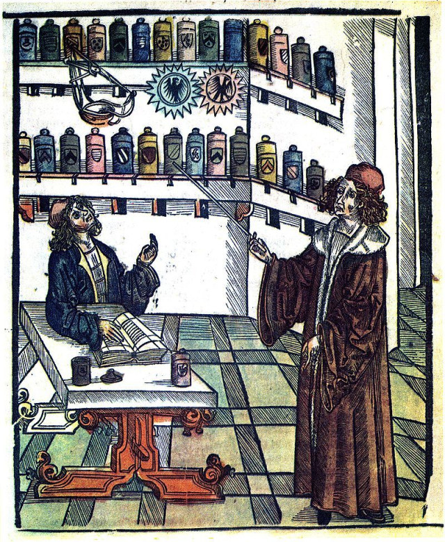 Перший з них – Андрій Трубач. Склавши присягу на правдиве свідчення, розповів, що пізно вночі почув якийсь галас на Ринку. Вийшовши з власної комори, він побачив перед собою двох озброєних аптекарчиків – слуг і учнів луцького аптекаря-райці Яна Гепнера. Вони вправно й відкрито, просто перед очима у чоловіка носили дерево з буди через Вірменську вулицю до Стиру. Шокований і здивований нахабством чоловік запитував аптекарчиків, навіщо ті шкоди чинять. Відповіді він не дочекався, побачивши натомість «самого пана Гепнера в білій кучмі з голим кордом, який за ними йшов».Лікар і аптекар. Ілюстрація із «Книги Життя», Флоренція, 1508 рік
