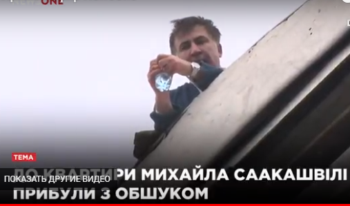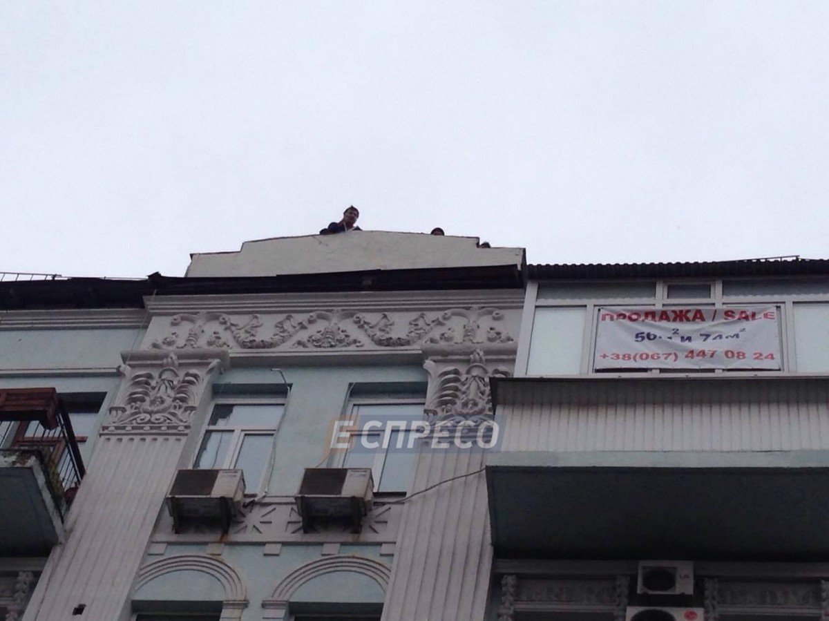 У Києві лідер партії «Рух нових сил» Михайло Саакашвілі виліз на дах будинку по вулиці Костьольна біля Майдану Незалежності через обшук у квартирі, де він живе.