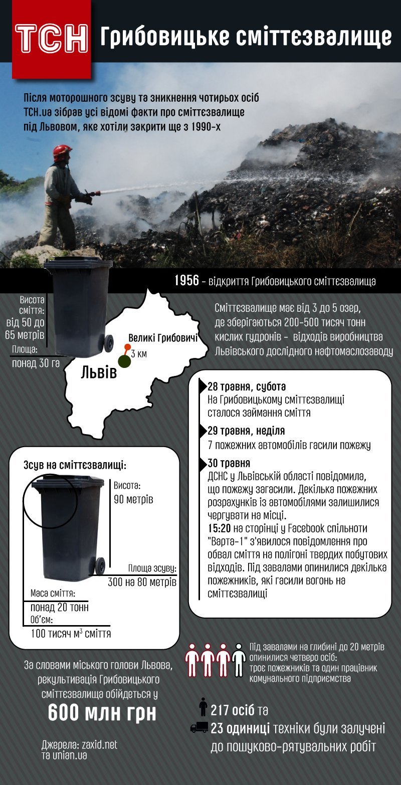 Як відомо, 29 травня на Грибовицькому сміттєзвалищі під Львовом виникла пожежа. Згодом з'явилася інформація, що під час гасіння пожежі стався зсув сміття. В результаті під завалами опинилися троє рятувальників. Надзвичайники загинули. За фактом зсуву відкрито кримінальну справу. Пізніше стало відомо, що на Грибовицькому сміттєзвалищі утворилася тріщина завдовжки близько 80 м і завширшки до 2,5 м в окремих місцях. Вершина сміттєвої гори просіла з часу першого зсуву на 2,5 м.