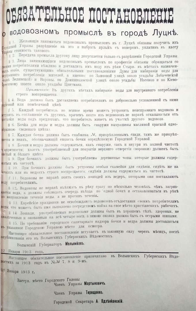 Набирати воду було дозволено тільки в спеціально відведених місцях, які встановлювала міська управа. Так, наприкінці ХІХ століття склалися звичні місця набирання води в річці Стир, які й закріпили законодавчо. Одне з них розташовувалося на вулиці Замковій (вулиця і досі має цю назву) біля садиби Лобачевської. Друге – на вулиці Домініканськиій (тепер Драгоманова) неподалік самого монастиря. А третє – на Вульці (проспект Волі) біля млина Пінчука і Цвітмана. Всі інші місця набирання були несанкціоновані.