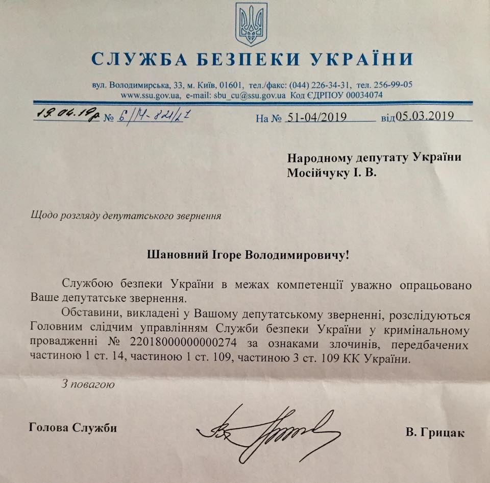 Він додав до посту відповідь СБУ на його депутатське звернення. У документі йдеться про те, що обставини, викладені Мосійчуком, «розслідуються Головним слідчим управлінням СБУ в кримінальному провадженні № 22018000000000274». Однак номер ЄРДР відповідає 2018 року. Пост Муджабаєва з’явився тільки в 2019 році (відразу після першого туру). Відповідно, або в СБУ помилилися, або нардеп неправильно інтерпретував відповідь правоохоронців, або ж заяву Мосійчука додали до якоїсь старої кримінальної справи.Нагадаємо, після першого туру виборів прихильники Порошенка закликали до сепаратизму та пропонували розстрілювати тих, хто не підтримав чинного президента.