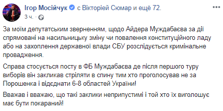 «За моїм депутатським зверненням щодо Айдера Муждабаєва за дії спрямовані на насильницьку зміну чи повалення конституційного ладу або на захоплення державної влади СБУ розслідується кримінальне провадження. Справа стосується допису в ФБ Муждабаєва, де після першого туру виборів він закликав стріляти в спину тим, хто проголосував НЕ за Порошенка, і від’єднати 6-8 областей України », – написав Мосійчук.