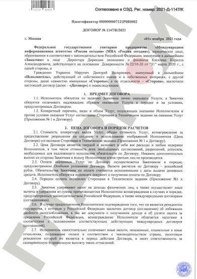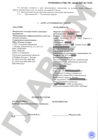 У розпорядження видання також потрапив договір про співробітництво, укладений між Маруничем і державним російським пропагандистським інформагентством «Россия сегодня». Документ датований 1 листопада 2021 року.