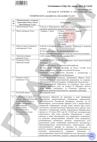 Документ свідчить, що за кілька місяців до війни Марунич, як експерт, зобов'язувався перед російським замовником виступати визначену кількість разів у проросійському інтернет-виданні «Украина.Ру».