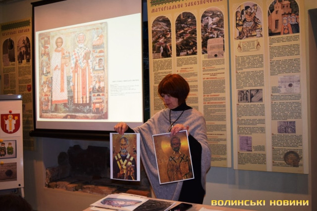 Лекторка порівнює зображення святого на іконах ХІІІ-XVII століть та на відбитках луцьких печатей за різні роки.