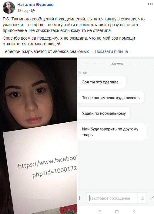 Н.Б. .: - І ще деталь. Був другий пост, де Влад попросив мене сфотографуватися з листком з посиланням на мій акаунт для підтвердження, що це моя сторінка. Я зробила цей знімок. Коли виклали другий пост, я була під гуртожитком зі своєю одногрупницею і їй тоді вже дзвонили журналісти, вже все роздувалося в коментарях. У мене телефон розривався від повідомлень, дзвінків в месенджер, всі писали, але я ж не могла прочитати.