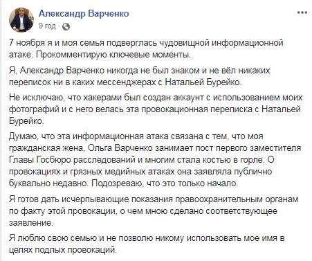 Олександр Варченко спростував звинувачення, назвавши те, що відбувається інформаційною атакою, пов'язаною з персоною його дружини. Ось що він написав з цього приводу: "7 листопада я і моя сім'я зазнала жахливої інформаційної атаки. Прокоментую ключові моменти. Я, Олександр Варченко, ніколи не був знайомий і не вів ніяких листувань ні в яких месенджерах з Наталією Бурейко. Не виключаю, що хакерами був створений акаунт з використанням моїх фотографій і з нього велася ця провокаційна листування з Наталею Бурейко ... Я готовий дати вичерпні свідчення правоохоронним органам за фактом цієї провокації, про що мною зроблено відповідну заяву. Я люблю свою сім’ю і не дозволю нікому використовувати моє ім'я в цілях підлих провокацій".Заява в прокуратуру