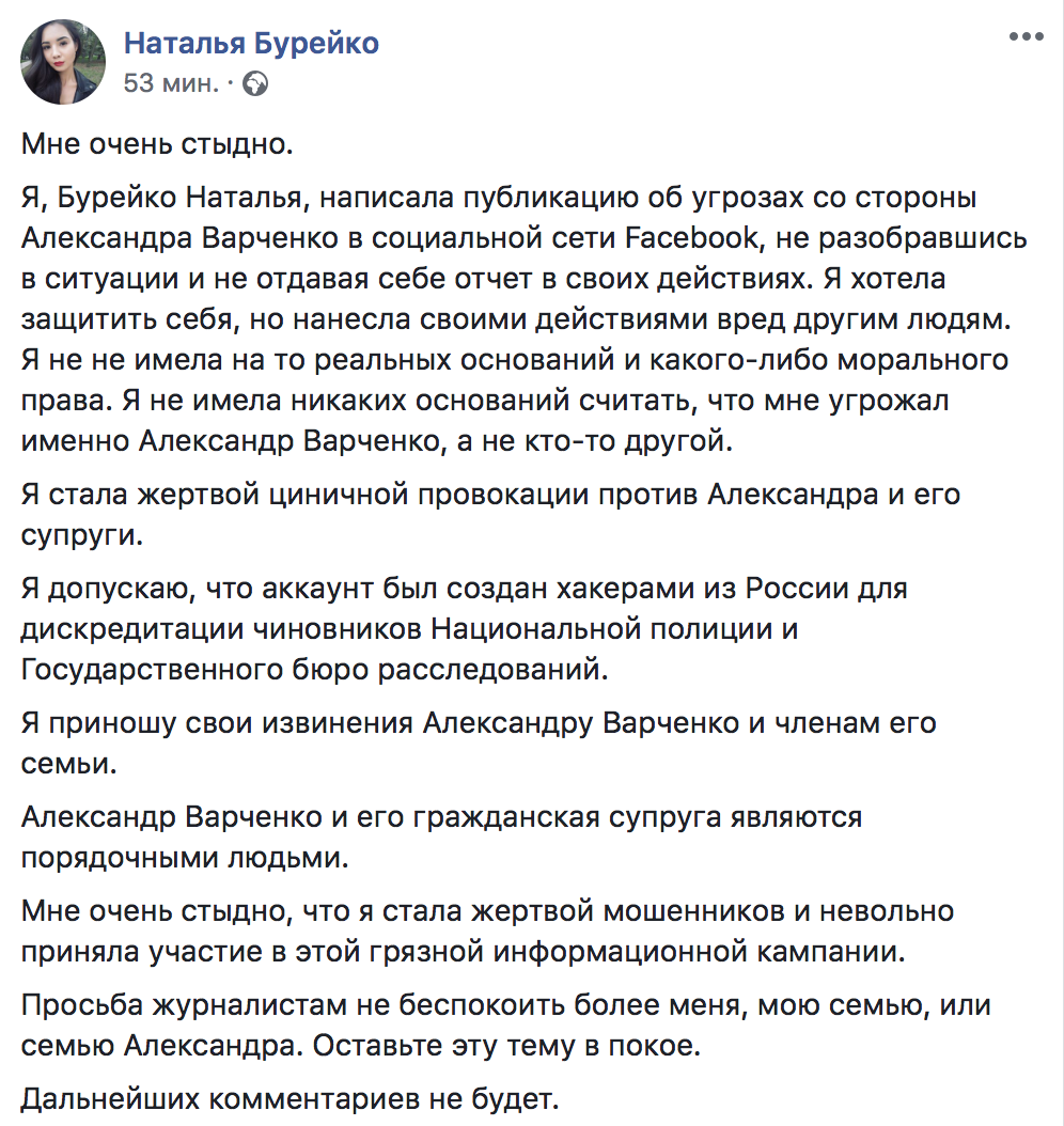 "Мені дуже соромно. Я, Бурейко Наталя, написала публікацію про погрози з боку Олександра Варченко в соціальній мережі Facebook, не розібравшись в ситуації. Я хотіла захистити себе, але завдала своїми діями шкоду іншим людям. Я не мала на те реальних підстав і будь-якого морального права. Я не мала ніяких підстав вважати, що мені погрожував саме Олександр Варченко, а не хтось інший.