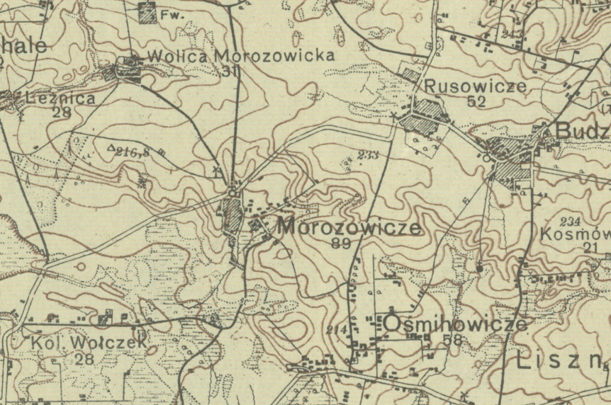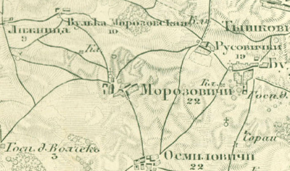 Морозовичі на карті початку ХХ ст. Ліворуч унизу в урочищі Вовчок позначений панський маєток.