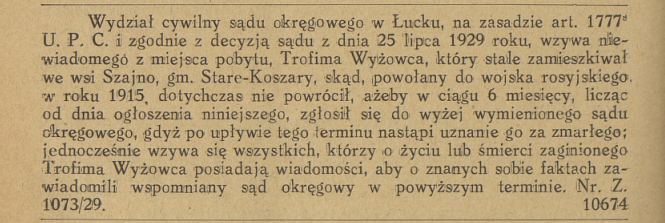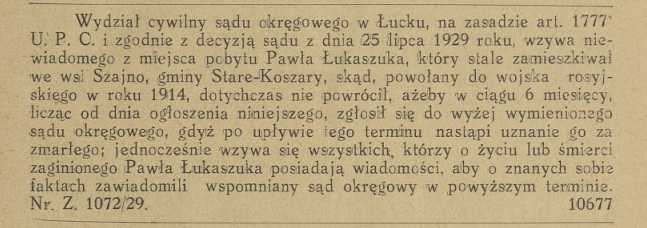 Оголошення 1929 року про розшук Павла Лукашука, який служив у російській армії і зник безвісти у 1914 році