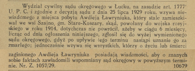 Оголошення 1929 року про розшук Андрія Лавренюка, який служив у російській армії і зник безвісти у 1914 році