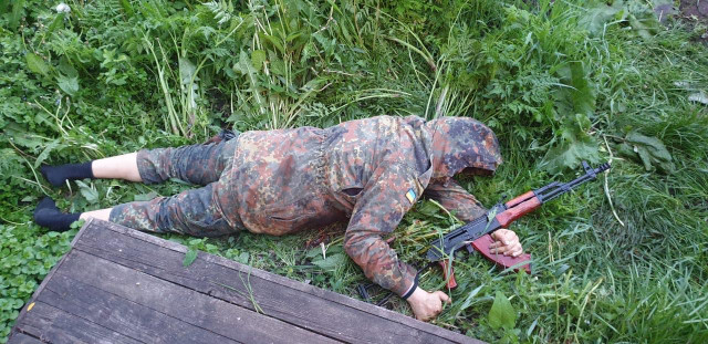 Ніхто дядька не виправдовує, але є нюанс. В них - _мінімум два_ нарізних 10-зарядних стволи (видно на фото). В нього - совкова двостволка. Плюс їх більше. І вони з бойовим досвідом майже всі. Зверніть увагу, в карабіні на фото видно, що він знятий із запобіжника, приклад розкладений. Може навіть з нього вистрелили раз чи декілька. Це при тому, що на тому, хто його тримає, навіть взуття нема. Якби вони почали перші, дядька вже б риби їли в ставку.