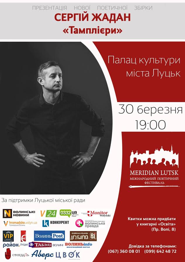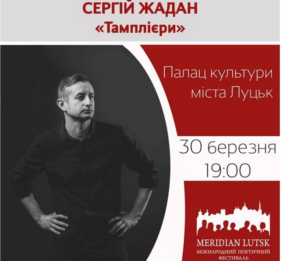 У рамках Міжнародного поетичного фестивалю Meridian Lutsk відбудеться презентація нової збірки Сергія Жадана «Тамплієри». Творчу зустріч організовують у четвер, 30 березня, в Палаці культури міста Луцька.