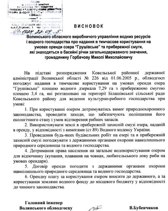 Окрім водойми, у користування передали і ділянку під нею та прибережну захисну смугу. Відповідний договір між тією ж таки Ковельською РДА і Миколою Горбачовим укладено наступного 2008 року. Розмір орендної плати за понад 10 гектарів землі становить 1069 гривень на рік. Тож загалом за 13 років користування озером Микола Горбачов мав би заплатити 16 713 гривень орендної плати і аж ніяк не тисячі доларів. Dogovir zemlia from SylaPravdy