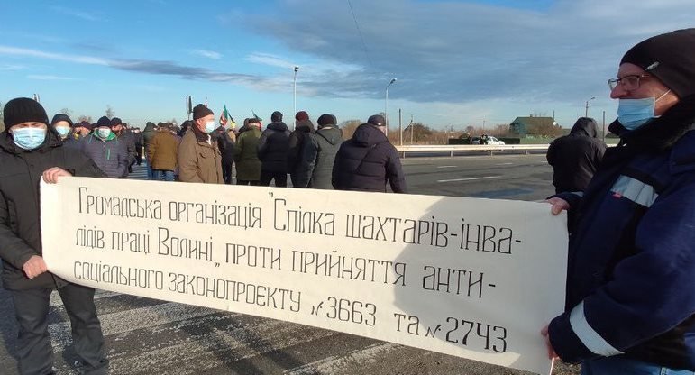 Представники громадської організації «Спілка шахтарів-інвалідів праці Волині» перекрили дорогу міжнародного значення на «Ягодин». Люди вимагають не вносити зміни до закону «Про загальнообов’язкове державне соціальне страхування».