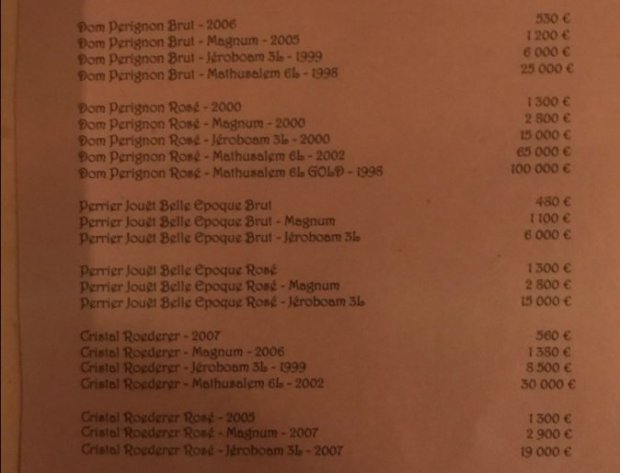 Інформацію про елітний алкоголь можна знайти на сайті для подорожей "TripAdvisor", де в профілі ресторану "La Mangeori" опубліковано фото алкогольного меню. Згідно з прейскурантом, шампанське "Dom Peregnion" 2005 року випуску справді коштує по 1200 євро за пляшку.