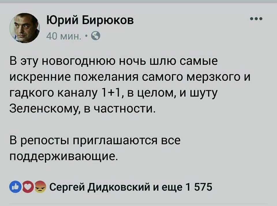 «У цю новорічну ніч шлю найщиріші побажання самого мерзенного й гидкого каналу 1 + 1, в цілому, і блазневі Зеленському, зокрема. В репости запрошуються всі, хто це підтримують», – написав радник гаранта Юрій Бірюков.Не менш експресивно відреагував телеведучий «5 каналу» Віталій Гайдукевич: