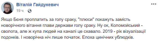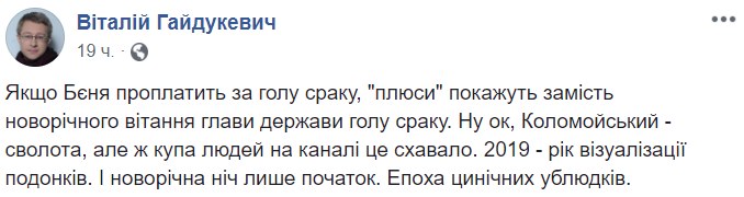 «Якщо Беня проплатить за голу ж...пу, «плюси» покажуть замість новорічного поздоровлення глави держави голу ж...пу. Ну ок, Коломойський – сволота, але бульшість людей на каналі це схвалили. 2019 – рік візуалізації покидьків. І новорічна ніч тільки початок. Епоха цинічних виродків«.У відповідь на істерику з президентського табору гендиректор «плюсів» Олександр Ткаченко заявив, що Порошенко злякався.