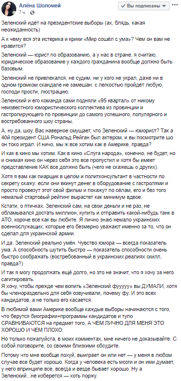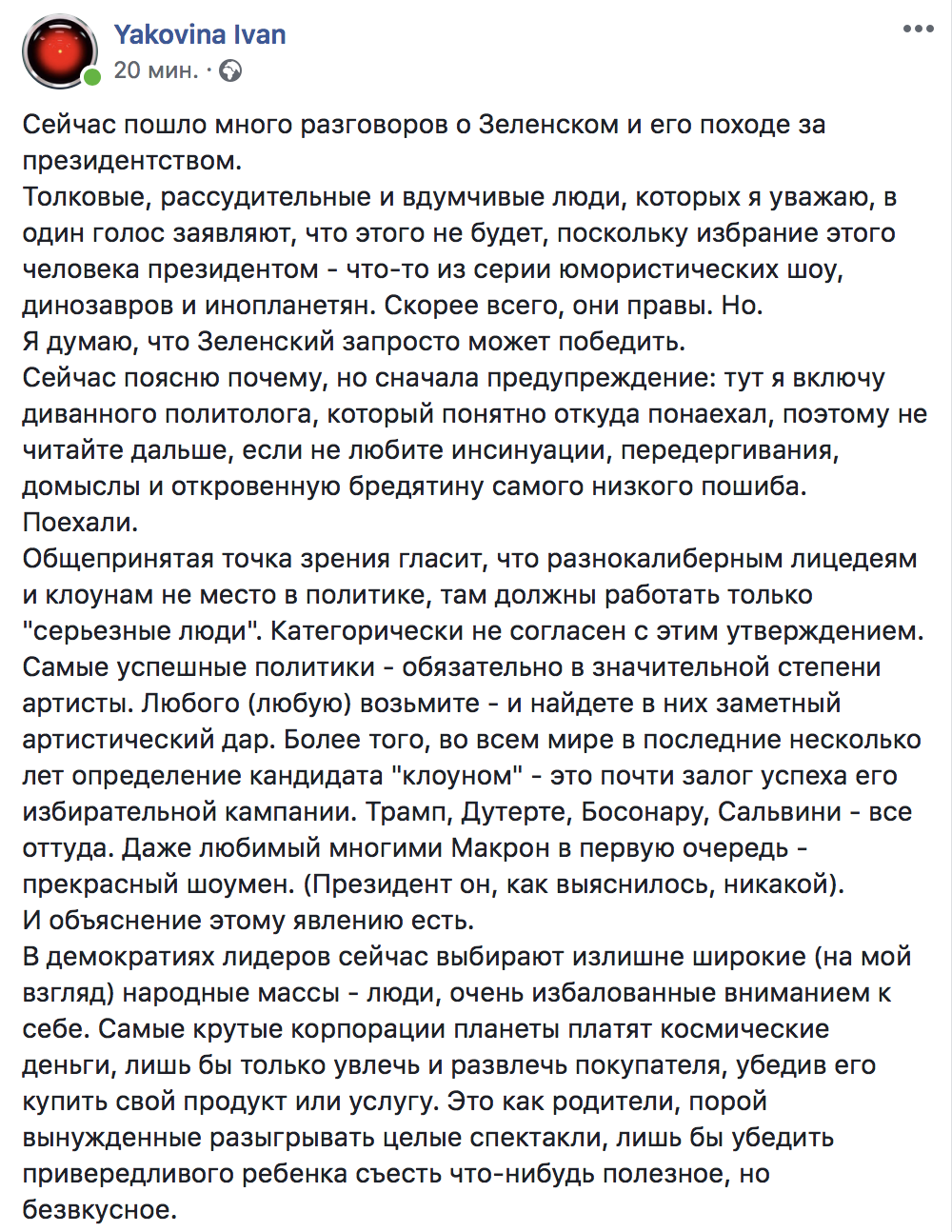 «Розумні, розважливі і вдумливі люди, яких я поважаю, в один голос заявляють, що цього не буде, оскільки обрання цієї людини президентом – щось із серії гумористичних шоу, динозаврів й інопланетян. Швидше за все, вони мають рацію. Але. Я думаю, що Зеленський запросто може перемогти.