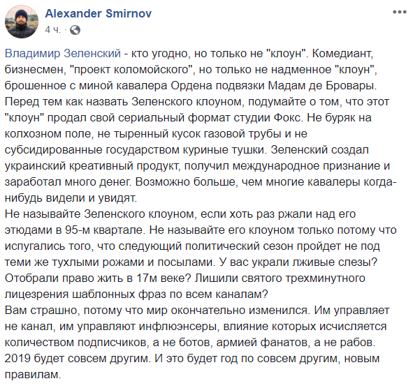 2019 буде зовсім іншим. І це буде рік по зовсім іншим, новим правилам», – вважає маркетолог Олександр Смирнов.Кому й чому не подобається Зеленський