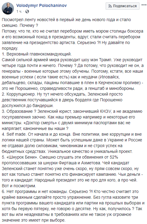 «Подивився стрічку новин в перший же день нового року і стало смішно. Чому? Тому, що ті, хто не вважав перебором мати мером столиці боксера і його можливий похід у президенти, раптом, стали вважати перебором заяву на президентство артиста. Серйозно?! Ну давайте по порядку.