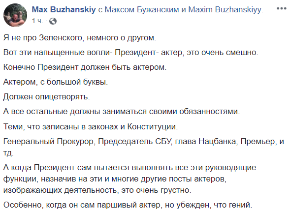 А тепер питання: Так чим такий підхід відрізняється від того, що потрібно зараз в Україні на шляху до успіху? Збирай кращих авторів законів, підбирай кращу команду виконавців – міністрів, пояснюй доступно свої дії людям, не кради і вперед. Українці самі країну на руках винесуть в лідери в Європі і можливо в світі. Адже винесли в 2014 у війні».«Ось ці пихаті крики – Президент-актор, це дуже смішно. Звичайно Президент повинен бути актором. Актором з великої літери. Має уособлювати. А всі інші повинні займатися своїми обов’язками. Тими, що записані в законах і Конституції. Генеральний Прокурор, Голова СБУ, глава Нацбанку, Прем’єр, і тощо.