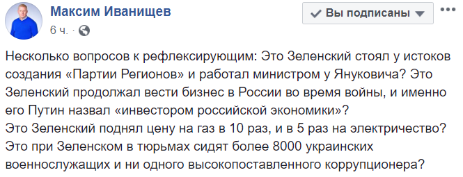 «Кілька питань до рефлексуючих: це Зеленський стояв біля витоків створення «Партії Регіонів» і працював міністром у Януковича? Це Зеленський продовжував вести бізнес в Росії під час війни, і саме його Путін назвав «інвестором російської економіки»?