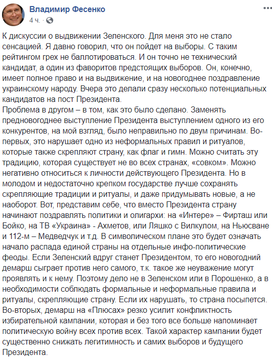 Якщо Зеленський раптом стане Президентом, то його новорічний демарш зіграє проти нього самого, тому що таку ж неповагу можуть проявляти і до нього. Тому справа не в Зеленському або в Порошенку, а в необхідності дотримання неформальних правил та ритуалів, що зміцнюють країну. Якщо їх порушувати, то країна розсипеться.